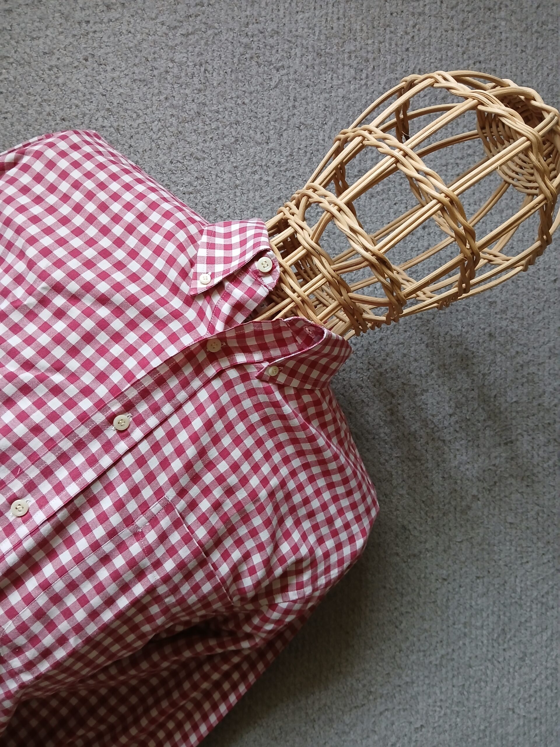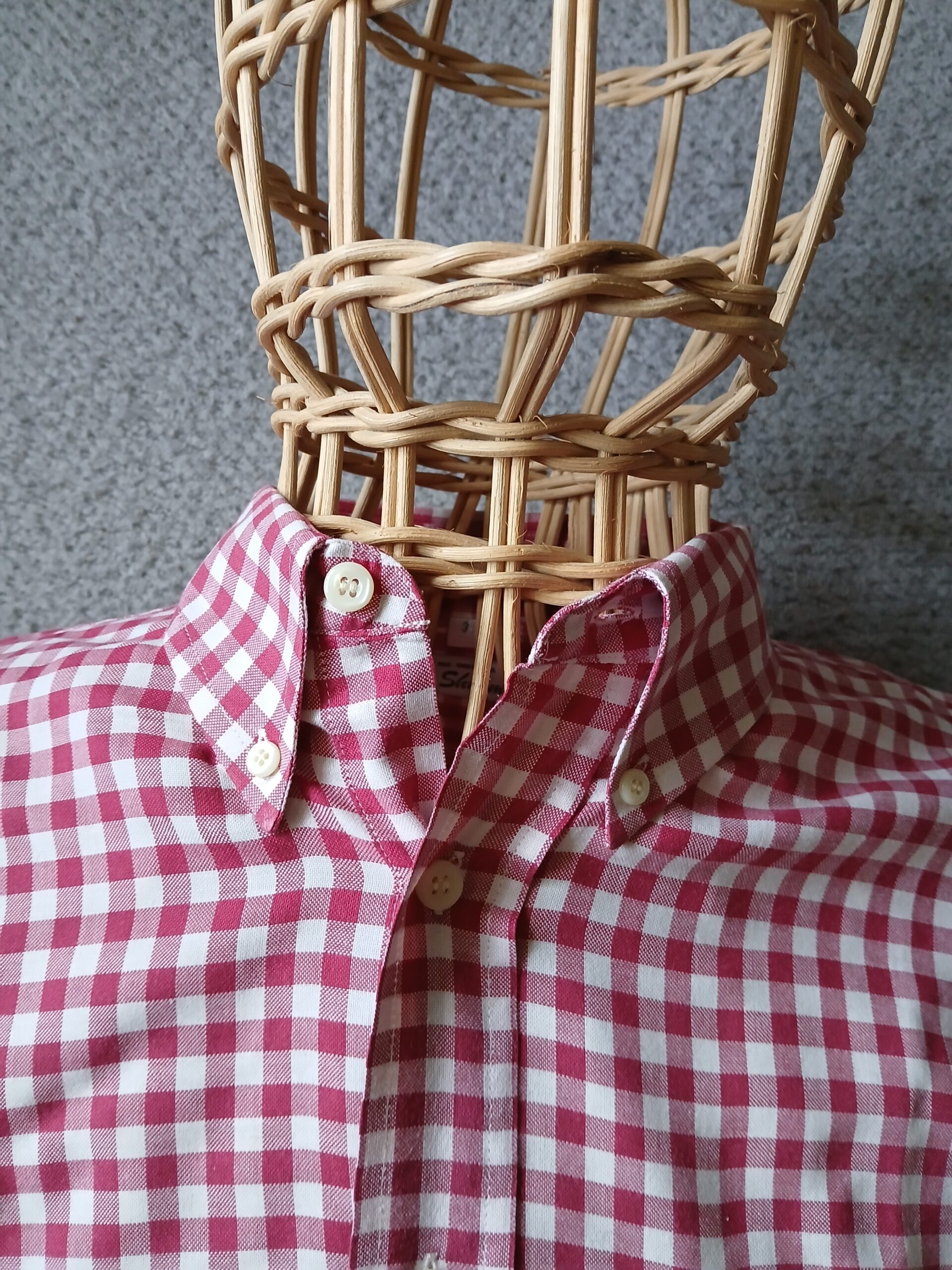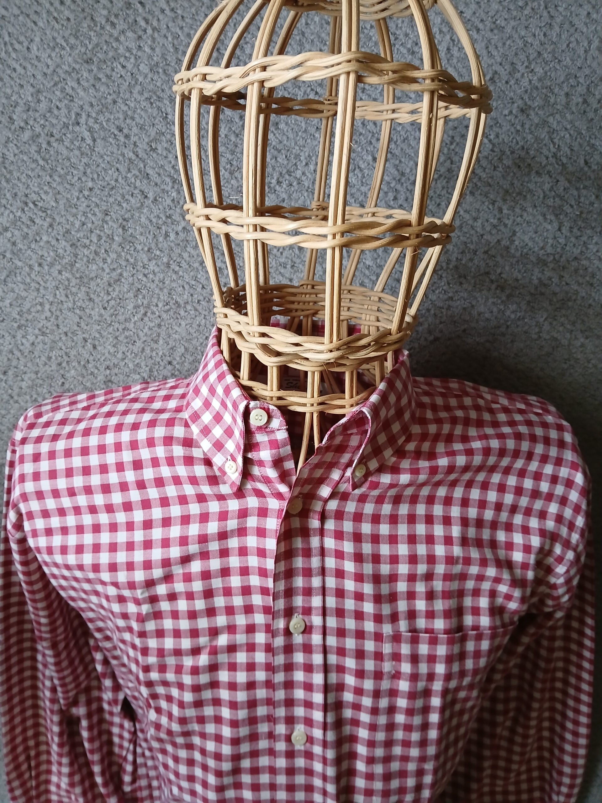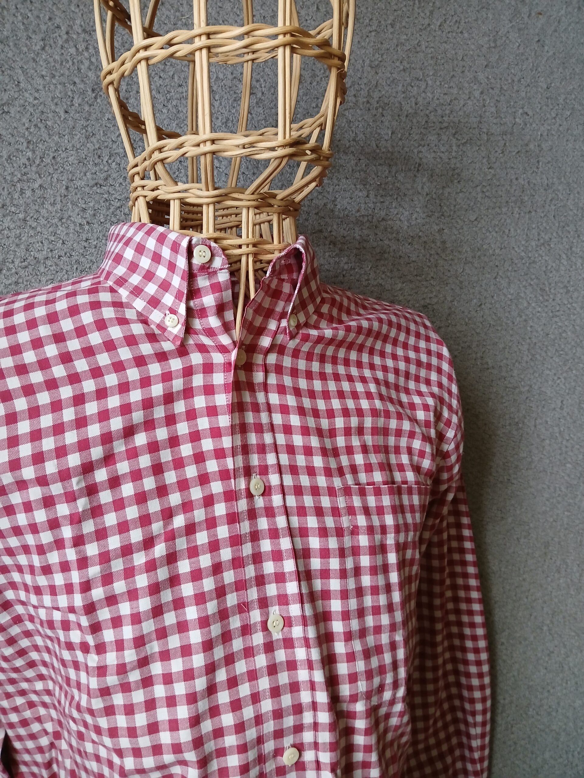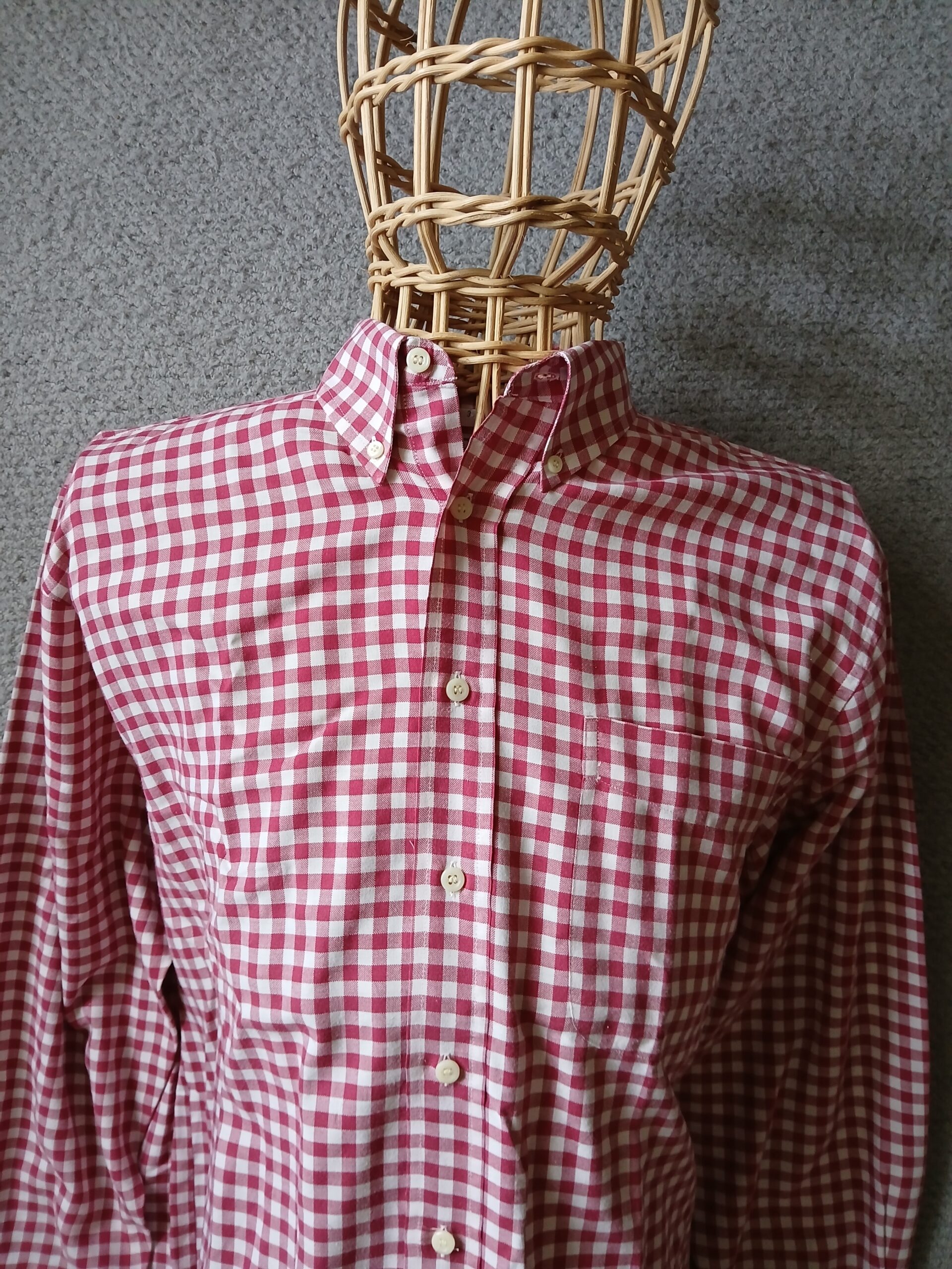 This Ben Sherman bdc shirt is a lovely red and white check pattern, and long sleeved. Size is 3, which is a large, generous sizing. Button on back of collar, brand new deadstock once more straight out of the packet. Nice collar length and size/roll. Good quality.