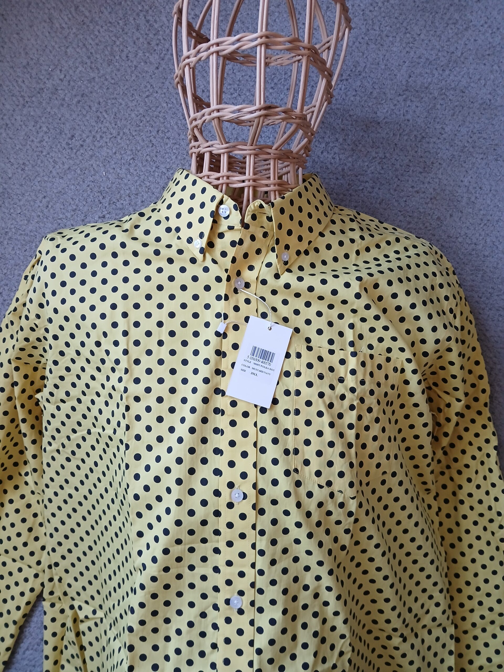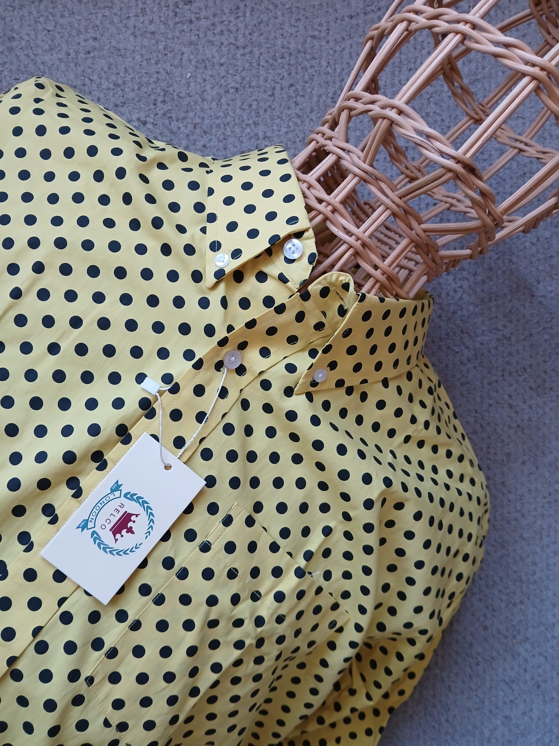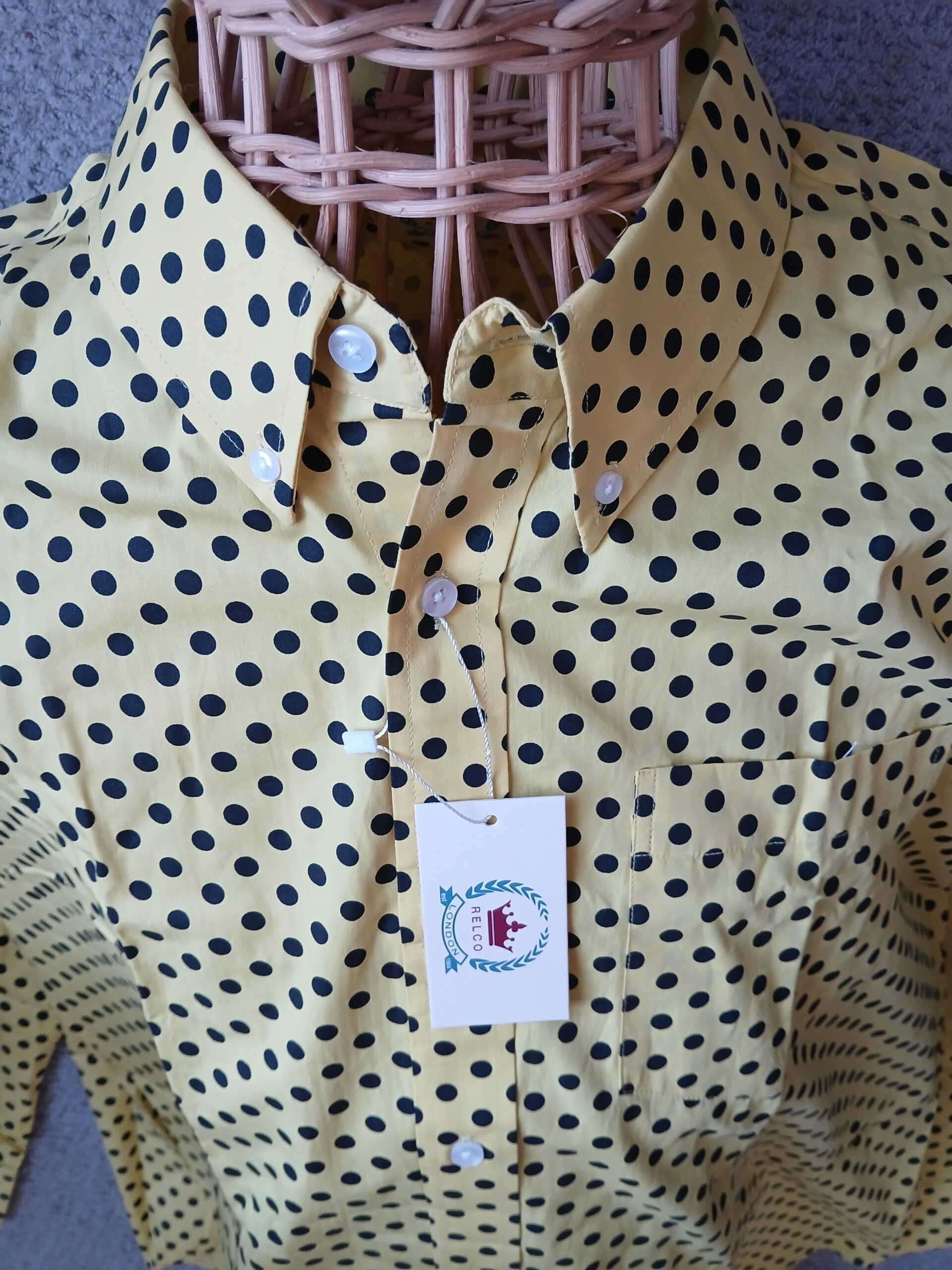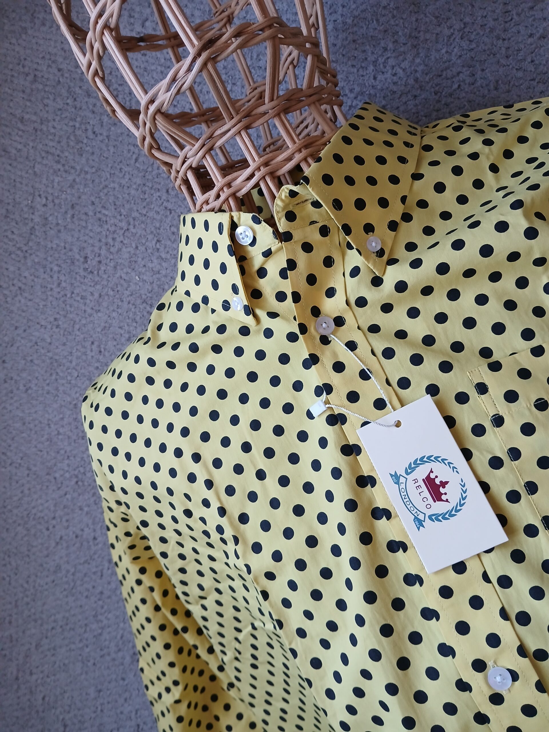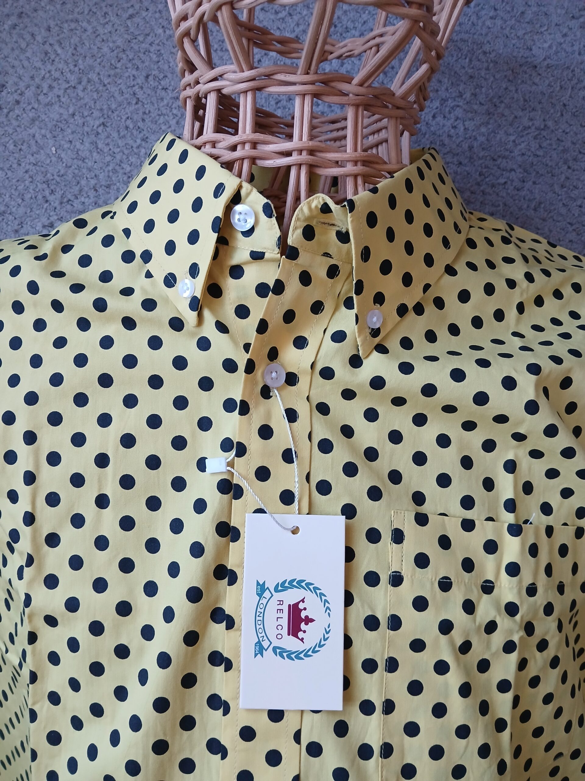 This Relco bdc shirt is yellow with black polks dots. Size is 3XL. Brand new deadstock once more straight out of the packet. Nice collar length and size/roll. Good quality.